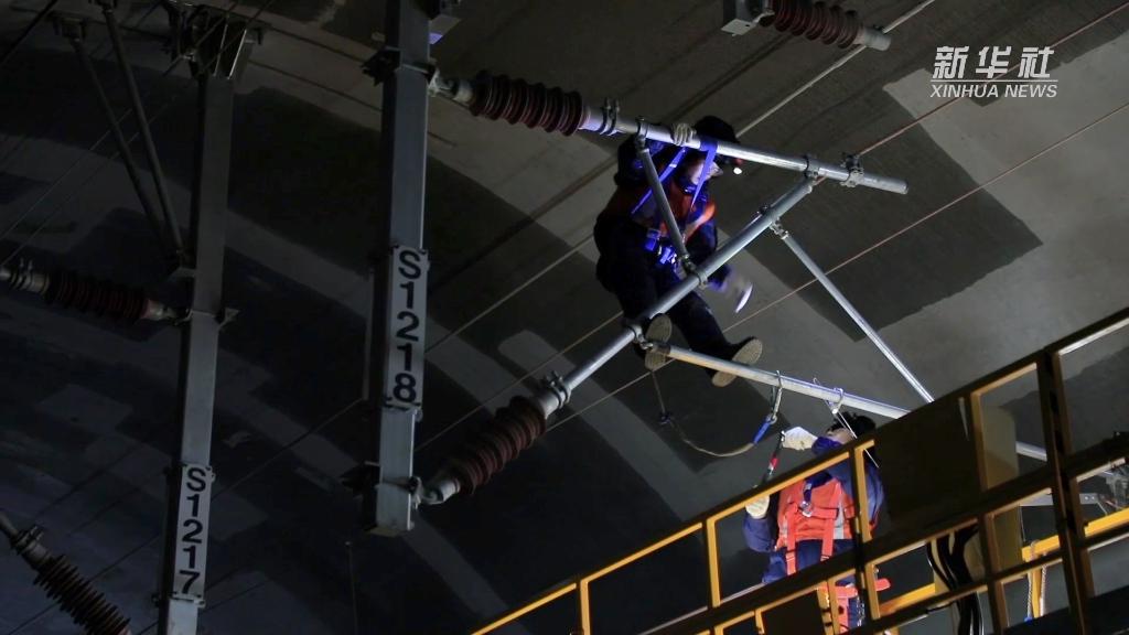 职工们每夜都要对高铁接触网关节式分相、隔离开关及引线等设备进行检修,在高空守护铁路安全畅通。